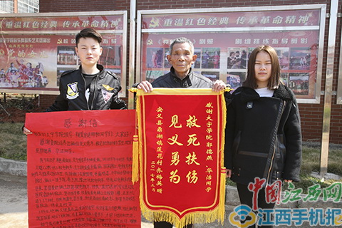 齐梅英奶奶家属送锦旗给郭德燕、华洁两名学生 3月1日16时许,南昌市安义县丁湖镇莲花村85岁的齐梅英老奶奶,乘坐其儿媳的电动三轮车去丁湖镇看病。回家的路上,电瓶车不慎翻倒在了马路旁的地沟里。当时齐奶奶感到肩部疼痛难忍,并被电瓶车压着动弹不得。我系的郭德燕、华洁两位女同学路过见到这种情况,立即挤进围观的人群,快步冲到地沟中,毫不犹豫地抬起电瓶车,将齐奶奶从电瓶车下解救出来。当得知齐奶奶肩部受伤时,她们又主动驾驶电瓶车,将齐奶奶护送到安义县人民医院急救科救治,在垫付挂号费后才悄然离开。3月4日,郭德燕、华洁又提着礼品前往医院看望齐奶奶,齐奶奶及其家属万分感激,要以现金的方式来报答她们,被她们婉言拒绝。在家属的再三要求下,她们才告诉齐奶奶的家属,自己是南昌职业学院的学生。