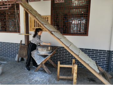 (舞蹈教师陈丽嫔体验米粉制作磨浆过程)