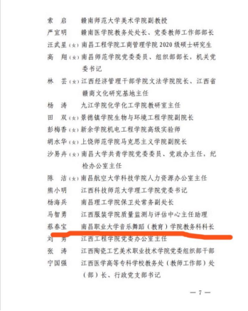 (音乐舞蹈学院 教育学院 段蓉报道)6月30日,为进一步弘扬正气、树立标杆,激励各级党组织和广大党员坚定信念、对党忠诚,履职尽责、建功立业,经学校党委推荐,省委教育工委决定,授予朱伟等100名同志为“全省教育系统优秀共产党员”荣誉称号;授予黄昊等100名同志为“全省教育系统优秀党务工作者”荣誉称号;授予南昌师范附属实验小学教育集团党委等100个基层党组织为“全省教育系统先进基层党组织”荣誉称号。 南昌职业大学音乐舞蹈\教育学院教务科科长蔡春宝老师荣获“全省教育系统优秀共产党员”。