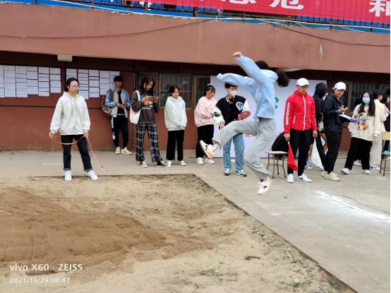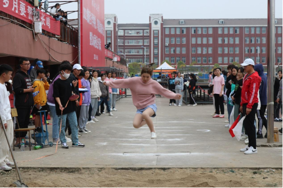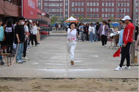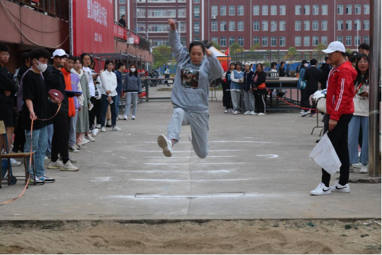 再让我们一起把目光转向三级跳远。三级跳远也有喜讯传来。恭喜音乐舞蹈教育学院的张智华同学获得三级跳远第三名的佳绩。在这一方场地俨然成为了你发光发热的舞台,一点点的蓄力,奋力一跳,像蚂蚱似的。空中的走步表演,引起阵阵喝彩。