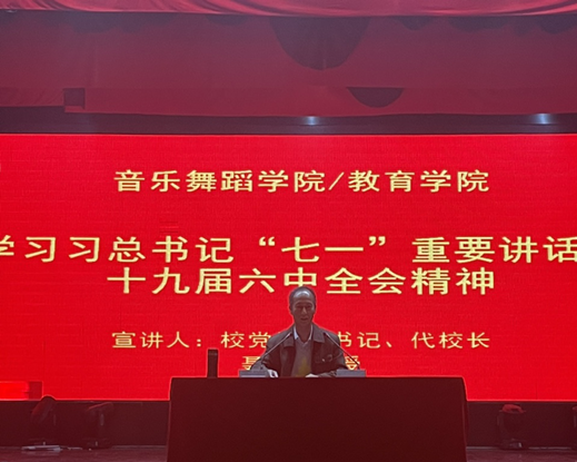 (音乐舞蹈学院 教育学院韦厚标 杨丽报道)11月16日下午,南昌职业大学校党委副书记、代校长聂剑教授在音乐舞蹈学院报告厅传达习近平总书记“七一”重要讲话暨十九届六中全会精神,音乐舞蹈学院\教育学院全体教师及学生党员参加学习。