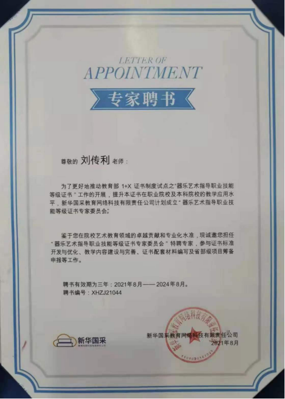 本网讯 通讯员 段蓉报道 为更好地贯彻《国家职业教育改革实施方案》精神,全面落实《关于在院校实施“学历证书+若干职业技能等级证书制度试点方案”》(教职成(2019)6号)工作要求,教育部1+X器乐艺术指导职业技能等级证书评价组织新华国采教育网络科技有限责任公司在各级教育部门、各试点院校的高度重视和大力支持下,于5月20日圆满完成了2021年度器乐艺术指导职业技能等级证书考评工作。我校音乐舞蹈学院刘传利副教授荣获1+X证书优秀培训教师。据悉,刘传利老师也是此证书的全国特聘专家和考评员。