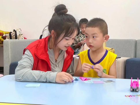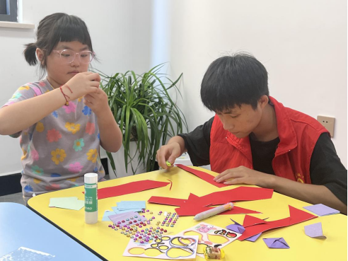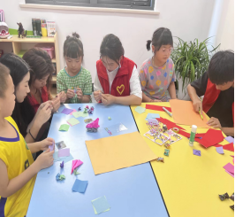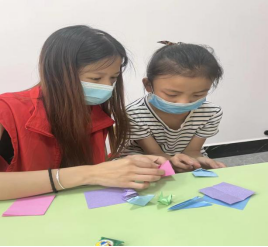 艺术小队对小朋友们进行一对一辅导,教小朋友折纸,孩子们在艺术小队志愿者的辅导下折爱心,折千纸鹤,剪小领带等等,手工活动丰富多彩。