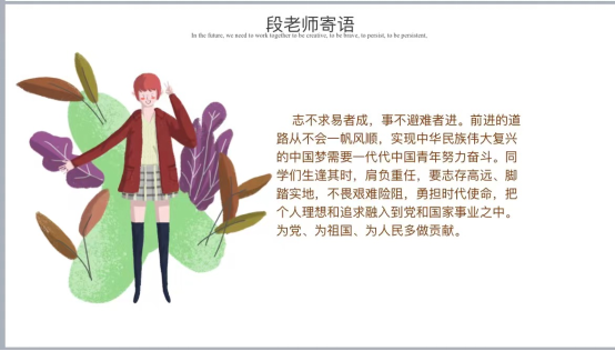 不知不觉,就迎来了班会的小尾巴,段蓉老师把近期的学习要求和防控要求等相关事项进行了全面梳理和强调。最后,她寄语每一位同学:志不求易者成,事不避难者进。前进的道路从不会一帆风顺,实现中华民族伟大复兴的中国梦需要一代代中国青年努力奋斗。同学们生逢其时,肩负重任,要志存高远、脚踏实地,不畏艰难险阻,勇担时代使命,把个人理想和追求融入到党和国家事业之中。为党、为祖国、为人民多做贡献。