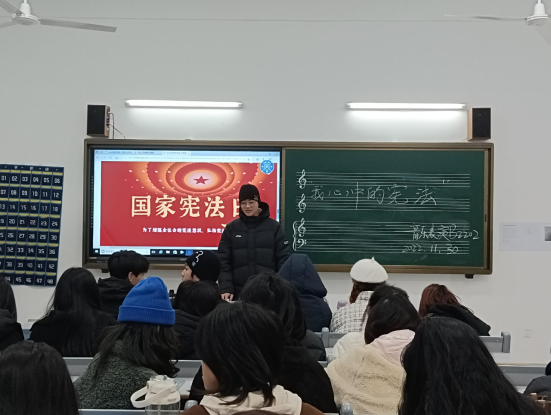 本讯网 通讯员 陈芸 报道 党的二十大开启了全面建设社会主义现代化国家、全面推进中华民族伟大复兴的新征程,法治中国建设掀开了新篇章。音乐舞蹈学院全体师生对宪法学习高度重视,组织了答题竞赛、宪法晨读宣誓、观看宪法宣传直播等活动。11月30日,音乐舞蹈学院音乐表演B2202班全体学生在XY109教室召开“我心中的宪法”主题班会,本次班会由班长胡钊玮同学主持。