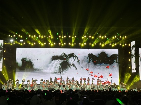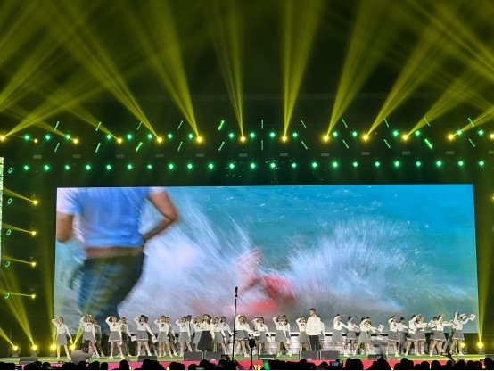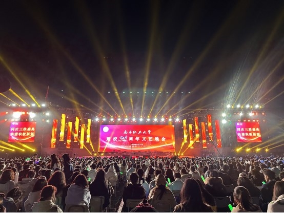 本网讯 盛世发报道 11月17日晚上,璀璨灯光下,欢声笑语中,学校万余名来宾和师生齐集学校运动场,共同欣赏音乐舞蹈学院师生自己编导和表演的文艺晚会。