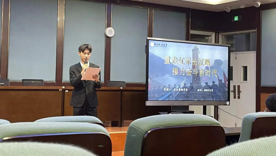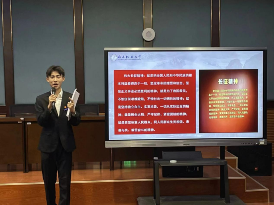宣讲会中,林承铭同学分享了自己在“重走红军长征路”上的所见所闻,深情讲述了革命前辈和先烈们的英雄事迹,用生动的故事,把同学们带入到了那段战火纷飞的岁月。从巾帼英雄“九趾女红军”王定国到“红军菩萨”龙思泉,再到一个个英勇献身长征路上的红军战士们,一个个铁骨铮铮的烈士跃然眼前,诠释着先烈们革命理想大于天的伟大信念,引导当代大学生珍惜来之不易的美好生活,争做勇担民族复兴大任的时代新人。
