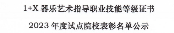 南昌职业大学获批2023年度“1+X器乐艺术指导职业技能等级证书优秀考核站点”,音乐舞蹈学院陈波、张英明、简姗姗三位老师获得2023年度“1+X器乐艺术指导职业技能等级证书优秀考评员”。