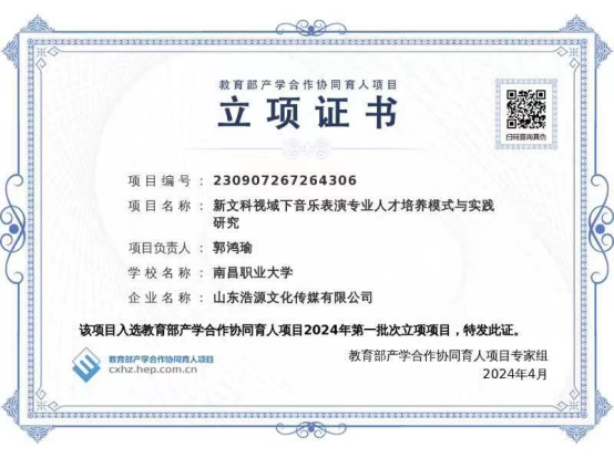 本网讯 蔡春宝 报道 近日,教育部高等教育司公布了2024年第一批产学合作协同育人项目立项名单,我院音乐表演教研室郭鸿瑜主任申报的《新文科视域下音乐表演专业人才培育模式与实践》项目获批立项。